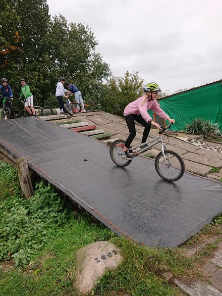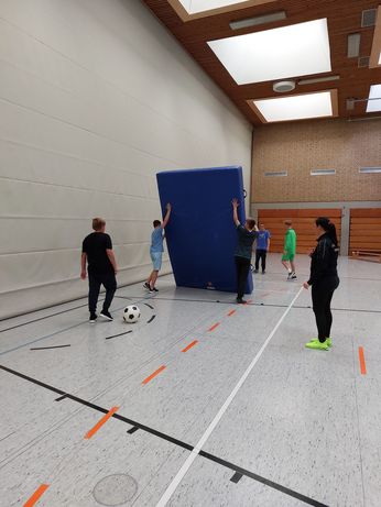 Nach einer ersten Einweisung wurde das gesamte Vereinsgelände mit den Trial-Rädern erkundet und erste Hindernisse über- oder unterquert. Es folgten spielerische Übungen wie Hütchen umwerfen und wieder aufstellen und ein Staffelrennen. Anschließend durften die St.-Anna-SchülerInnen sich frei ausprobieren, immer versehen mit den fachmännischen Tipps des ÜL Jannis Oing. Der Workshop endete mit einer abschließenden Fragerunde und einem begeisterten Sporthelferkurs.