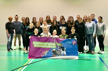 Zugleich informierte Annette Hülemeyer die Schülerinnen über die weiteren Qualifizierungswege im Sport (vom Sporthelfer zum Übungsleiter) und über ihre Einsatzmöglichkeiten im Sportverein. Denn Sporthelfer/innen sind nicht nur gefragt für die Leitung von Sportangeboten für jüngere Mitschüler/innen oder als Unterstützer/innen bei Sportfesten, sondern auch im Sportverein bestehen vielfältige Einsatzmöglichkeiten für die Jugendlichen. Sie können als Helfer/innen in Sportvereinsgruppen eingesetzt werden oder bei Veranstaltungen im Sportverein unterstützen (z.B. Wettkämpfe, Ferienangebote) oder auch in Jugendgremien mitwirken. Dafür ist es wichtig, die Strukturen im Sportverein zu kennen und zu wissen, wen ich im Verein anspreche für zukünftige Einsätze. Einen ersten Einblick in diese Rolle haben die Sporthelferinnen durch eine Hospitation im Verein bekommen.