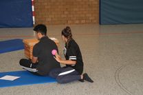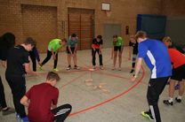 Zugleich erläuterte Annette Hülemeyer die weiteren Qualifizierungsmöglichkeiten im organisierten Sport. Im Anschluss an die Sporthelfer-Ausbildung in der Schule können die Jugendlichen den zweiten Teil der Ausbildung z. B. in den Oster-, Sommer- oder Herbstferien bei der Sportjugend im KSB Borken absolvieren und hätten damit zugleich den Einstieg in die ÜL-C-Ausbildung gemacht, da die Sporthelfer-Ausbildung als ÜL-C-Basismodul anerkannt wird. Alternativ können sie sich auch sportartspezifisch weiterbilden und zum Beispiel ein Sporthelferzusatzmodul „Volleyball“ (10 UE) absolvieren und dann die 20stündige Sporthelfer-Volleyball-Ausbildung Teil II des Westdeutschen Volleyball-Verbandes besuchen und damit das Grundmodul der C-Trainer-Ausbildung erwerben.