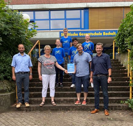 Während ihres Besuchs überreichte Annette Hülemeyer zudem ein Schild an den Schulleiter Horst te Wilde und zeichnete damit das Berufskolleg Bocholt-West als Sporthelfer-Schule im Kreis Borken aus. Damit wird das jahrelange Engagement des Berufskollegs in diesem Bereich gewürdigt, welches insbesondere unter der Leitung der Sportlehrkräfte BernhardGrothaus und Alexandra Heinz geleistet wird. Horst te Wilde betonte: “Der Erwerb des Sporthelfer-Qualifikationsnachweises und der spätere Erwerb der ÜL-C-Lizenz bestärken unsere Schüler/innen, frühzeitig Verantwortungzu übernehmen und auch im Sportverein Sportgruppen zu leiten.”